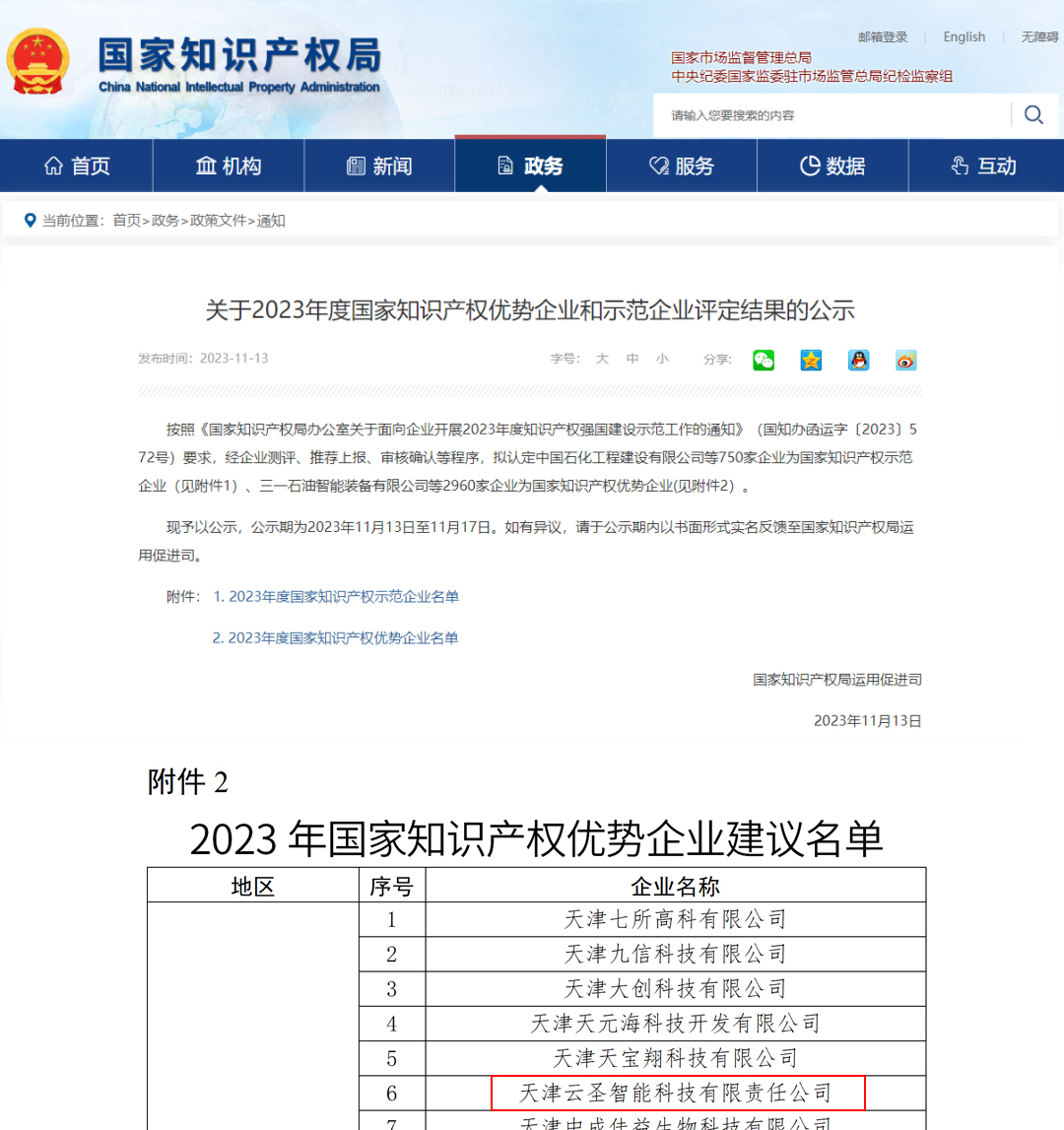 国家荣誉,科技创新丨云圣智能获评“2023年国家知识产权优势企业”荣誉称号