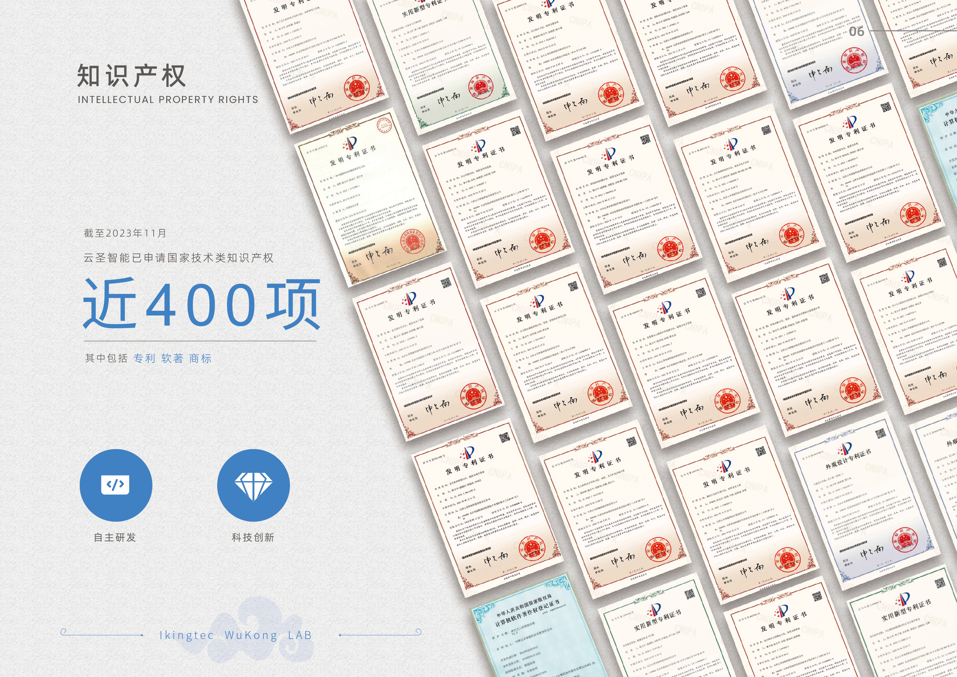 云圣智能自成立以来,建立并持续优化技术创新的内部管理机制,不断完善知识产权管理体系,在商标、专利、著作权等知识产权的创新、应用、管理和保护等方面均取得了丰富成果,并已通过知识产权管理体系认证。截至目前,云圣智能申请发明专利、外观专利、实用新型专利、软件著作权、商标近400项。