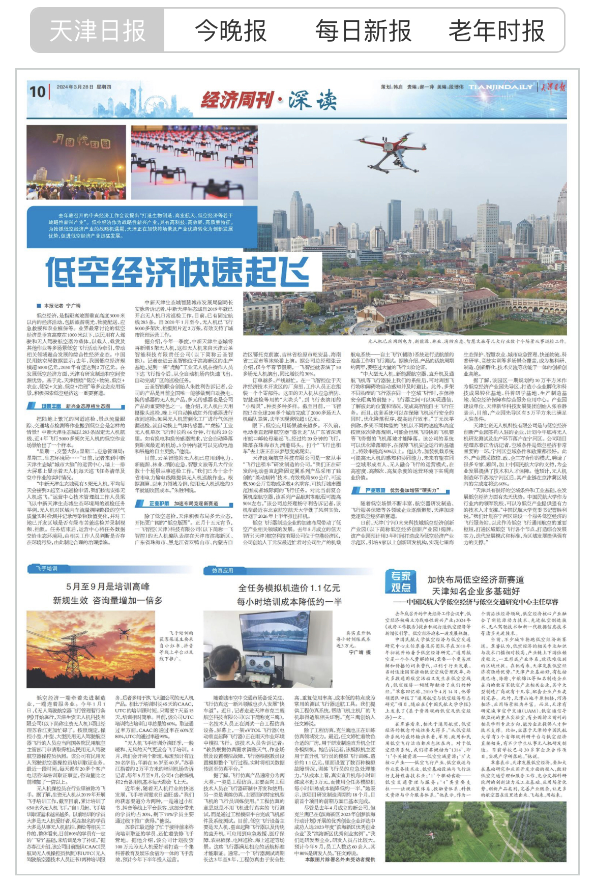 去年底召开的中央经济工作会议提出“打造生物制造、商业航天、低空经济等若干战略性新兴产业”。低空经济作为战略性新兴产业,具有高科技、高效能、高质量特征。为抢抓低空经济产业的战略机遇期,天津正在加快将场景及产业优势转化为创新发展优势,促进低空经济产业迅猛发展。