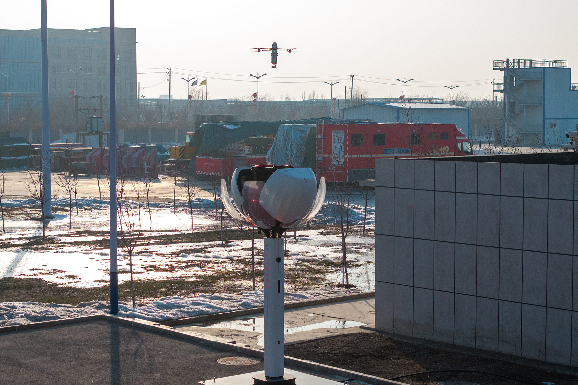 据了解,智慧园区巡检系统由“圣·宝莲灯全自主无人机巡检系统”“虎鲸·虎穴全自主无人机巡检系统”组成。昌吉高新区计划于3月底将该系统投入使用,届时能够提升园区多项工作的管理能力。现场负责安装调试的天津云圣智能科技有限责任公司技术人员胡伟介绍:“宝莲灯全自动机场采用立杆式分体组装设计,占地仅需0.25平方米,机场本体重量仅为90公斤,可覆盖7公里作业半径巡检范围,仅需53秒就可实现无人机电池与吊舱的全自动更换。此外,我们的无人机不仅实现了自动起降,自动更换电池、传感器,自动传输分析数据等功能,也在硬件上完成了对工业作业的适应,在7级大风、零下40度、高原、风沙、强腐蚀等恶劣环境作业都能游刃有余。”