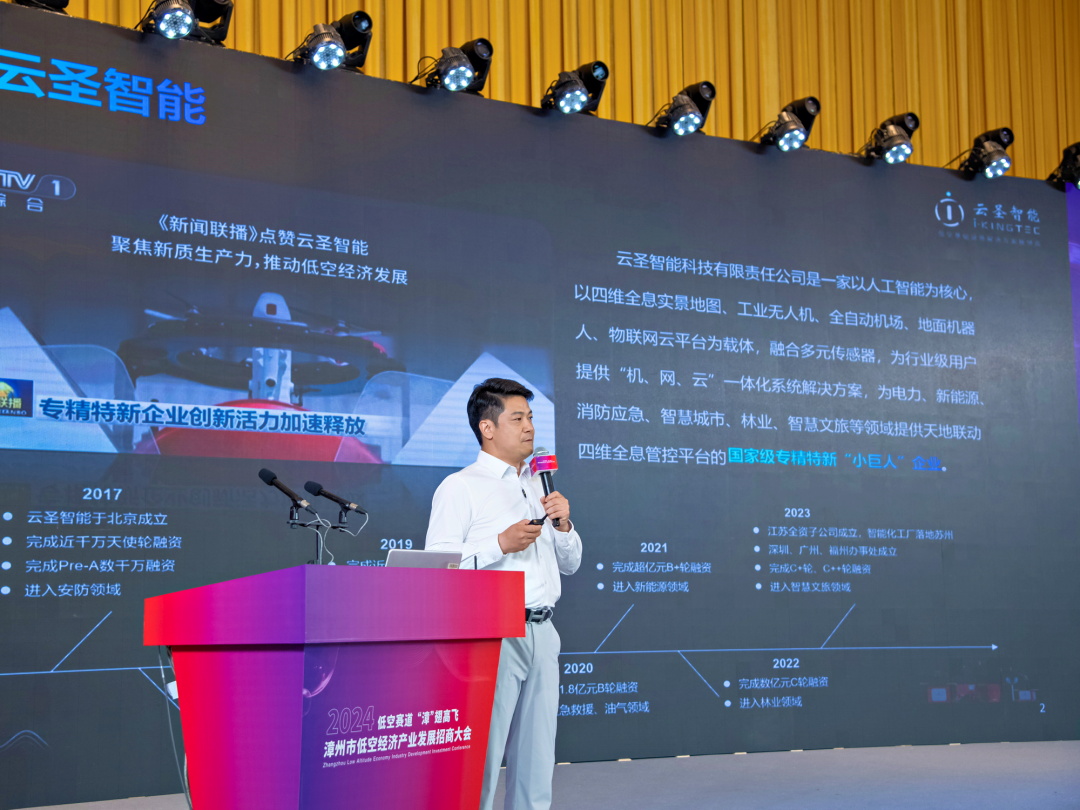 云圣智能在大会进行了产品展示和实飞,受到了到场嘉宾的一致好评。在下午的论坛环节,朱胜利博士受邀做了题为“一网管全城,一屏观天下——助力漳州低空经济腾飞”的主题演讲。